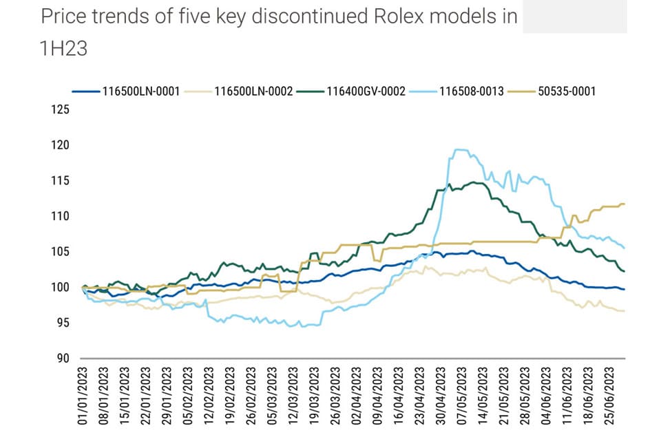 2023年轉眼已經過了一半,但是那些高知名度大品牌的熱門錶行情還是沒有明顯止跌回升的跡象,就算是紅透半邊天的勞力士也是一樣,根據摩根士丹利引用高級手錶市場調查研究機構WatchCharts的市場即時數據,勞力士最熱門的手錶從2023年1月至今,平均價格又再小跌了2.2%。