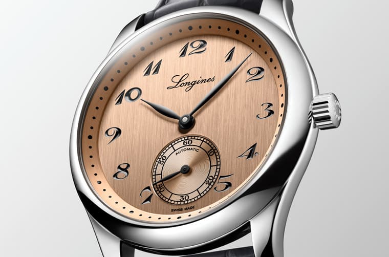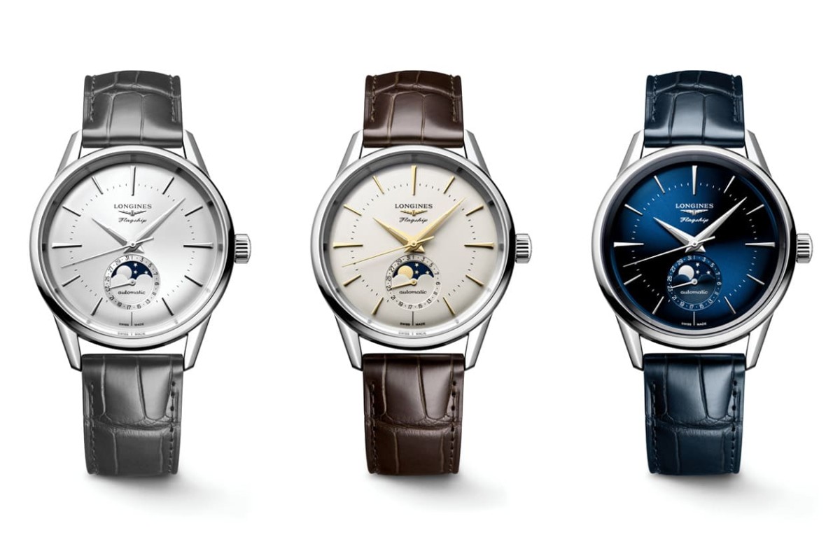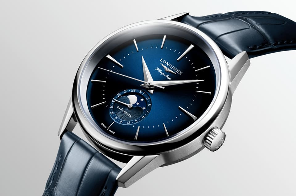 首先看的是Flagship Heritage,Flagship是1950年代末期就一路竄紅成品牌的代表性產品,2023年品牌將月相功能融入這款系列中,錶款延續1957年原版作品的獨特弧形面盤,品牌再從中延伸出銀色蛋白石、銀色或藍色陽光放射紋三種配色版本。面盤鑲有鍍金或銀色時標,其中3、9與12點鐘方位的時標採用加長設計襯托出面盤的復古情懷,而浪琴表也會視面盤顏色替手錶搭配棕色、灰色或藍色皮革錶帶。