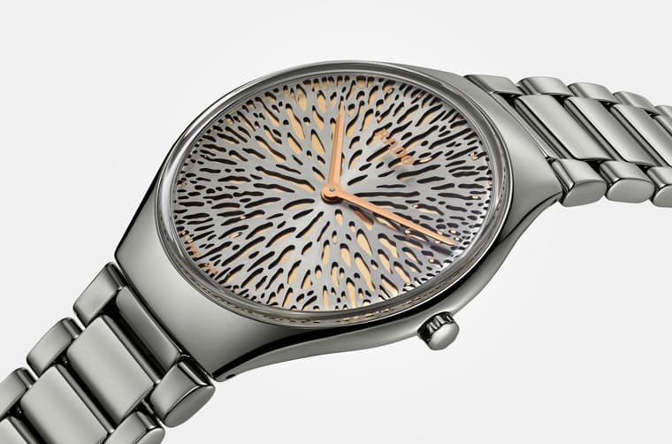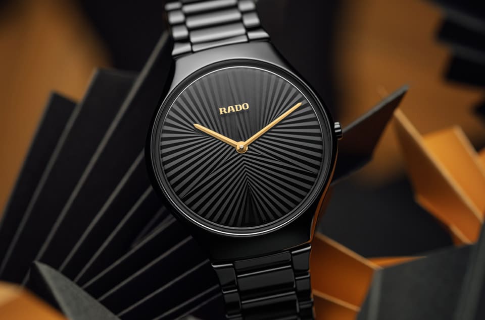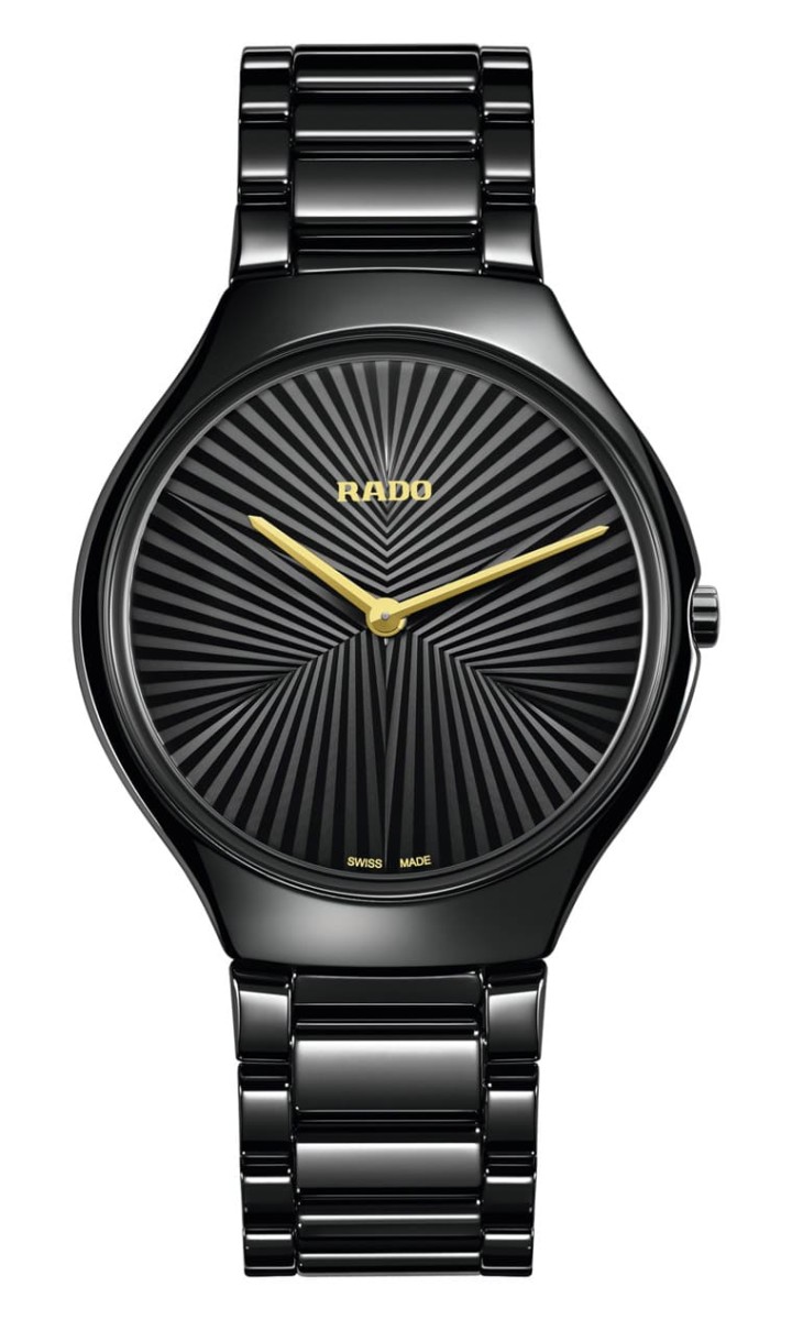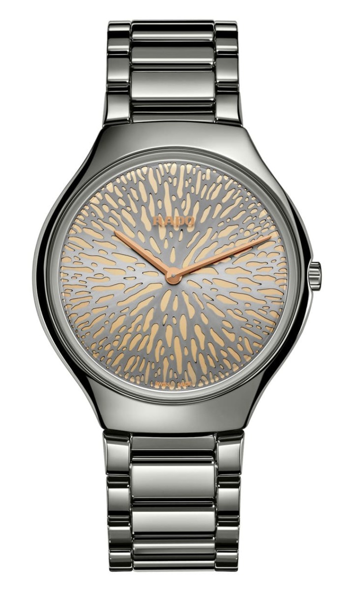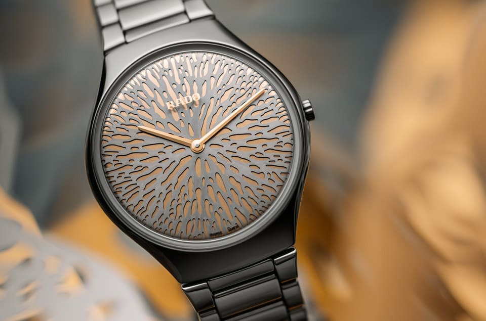True Thinline真我超薄系列世界花園合作款有一款採用黑色陶錶殼,面盤黑灰相間的放射線條再現夏威夷金棕櫚樹葉的皺摺之美,搭配鍍金指針能夠清楚指示時間,同時12點方向的RADO標指同樣採用金色系展現高雅風格。手錶搭載雷達表R766自動機芯,這枚機芯內含Nivachron™抗磁游絲、動力儲存達64小時,走時精準度則通過5方位調校標準測試,確保手錶不只外觀簡潔有致,內部的穩定性也能令人感到安心可靠。