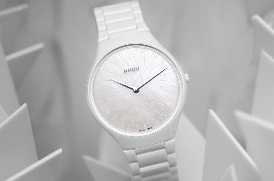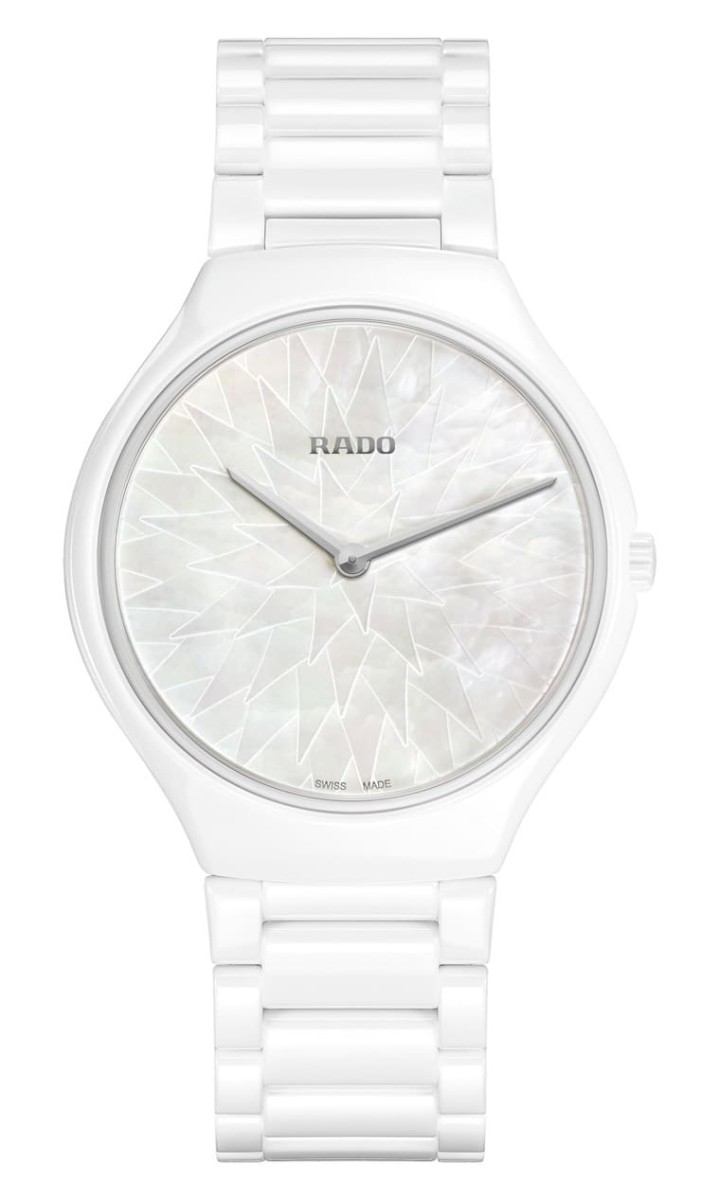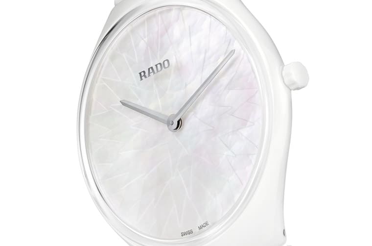 白色高科技陶瓷材質/Rado R766自動上鍊機芯/時、分顯示/南洋杉典型生長結構造型珍珠母貝面盤/藍寶石水晶鏡面/防水30米/錶徑40mm/參考價:NT$ 87,400
