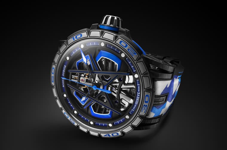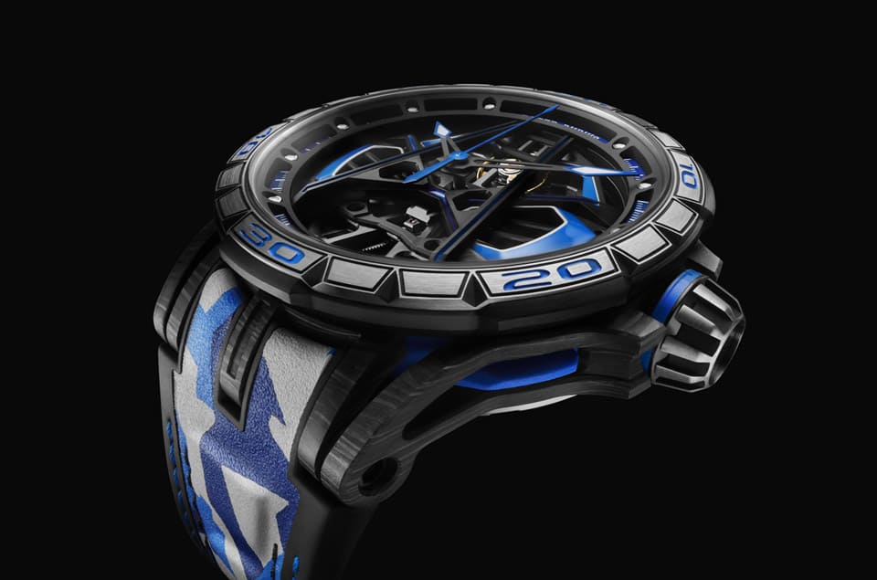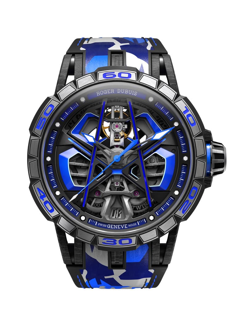 由於手錶整體色調改成藍色,所以其所搭配的目迷彩圖案也同步改為藍色調。羅杰杜彼製作錶帶時用上一種名為結合硫化(Combined Vulcanisation)的工藝——製作過程中利用多個彩色板塊進行硫化結合,使錶帶上的不同色塊能呈現完全無縫的外觀,和一般橡膠錶帶比起來,製作工時少說會增加3成以上。錶帶內側為黑色橡膠製作,表面帶有倍耐力Trofeo R輪胎的紋理,而且手錶也蘊含錶帶快拆系統,想要更換錶帶只要靠自己三兩下就能達到目的。