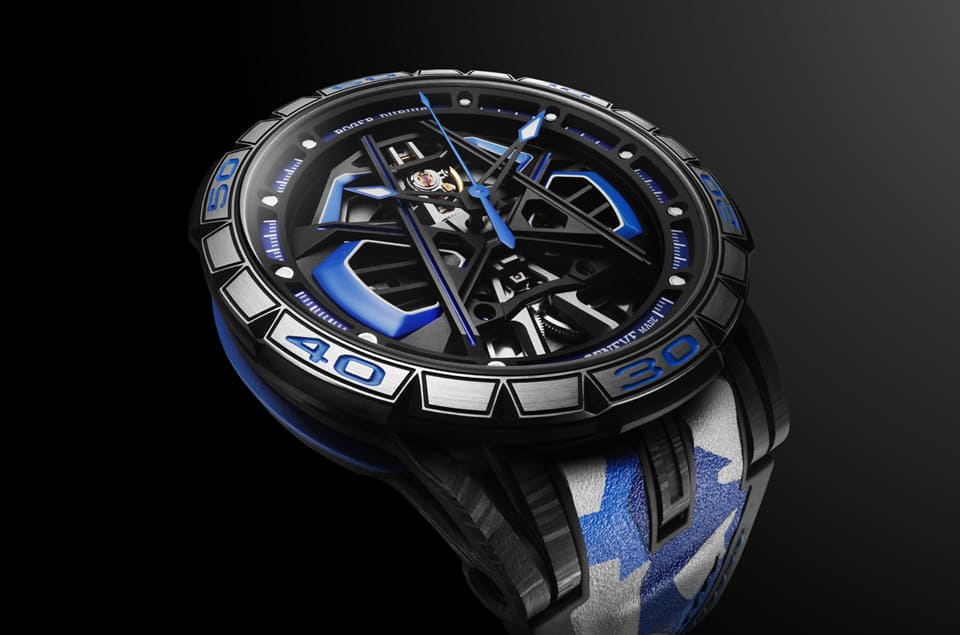 ROGER DUBUIS羅杰杜彼繼2022年後又推出一款Excalibur Spider Huracán Sterrato Monobalancier王者競速系列單擺輪腕錶Huracán Sterrato限量版,有別於上一款作品採用鮮豔耀眼的橘色調,2023年新作改採絢藍色調,搭配科技材質彰顯LAMBORGHINI超跑般的型格魅力。