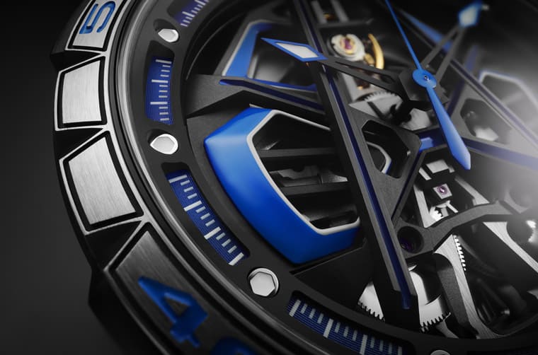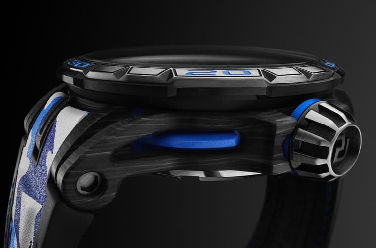 王者競速系列單擺輪腕錶Huracán Sterrato限量版採用SMC(Sheet Molding Compound)片狀模塑複合碳纖維材質打造錶殼,這種材質比黃金輕9倍但卻又堅固耐磨,同時錶圈是用黑色DLC塗層鈦金屬,其中錶圈有阿拉伯數字刻度的部分還有特別加厚,提供手錶更全方位且穩固的保護性。錶殼側面的鏤空設計露出藍色橡膠條,羅杰杜彼設計靈感來自超跑的尾翼,至於螺栓形的錶冠又是從Huracán賽車的螺帽獲得啟發,光是錶殼造型就有不少從賽車上擷取的元素。