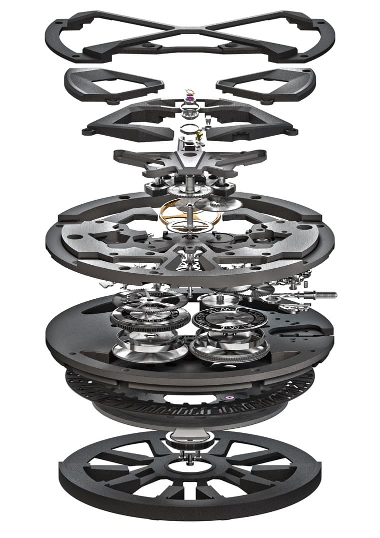 ▲RD630自動上鍊機芯零件數多達233枚,其日期顯示以及輪圈造型的鏤空自動盤富有高度品牌原創性。
