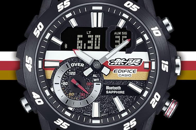 錶款在功能性方面的表現無庸置疑,一般卡西歐石英錶該有的功能它幾乎都具備,同時還有Bluetooth®藍牙連線功能,佩戴者在手機上先下載好CASIO WATCHES專屬App後,就可以運用手錶和手機互連,確保手錶的時間資訊維持在最正確的狀態,讓車迷們可以把握每次MUGEN出賽的時間,戴上手錶表現自己對於賽車的熱愛和支持。