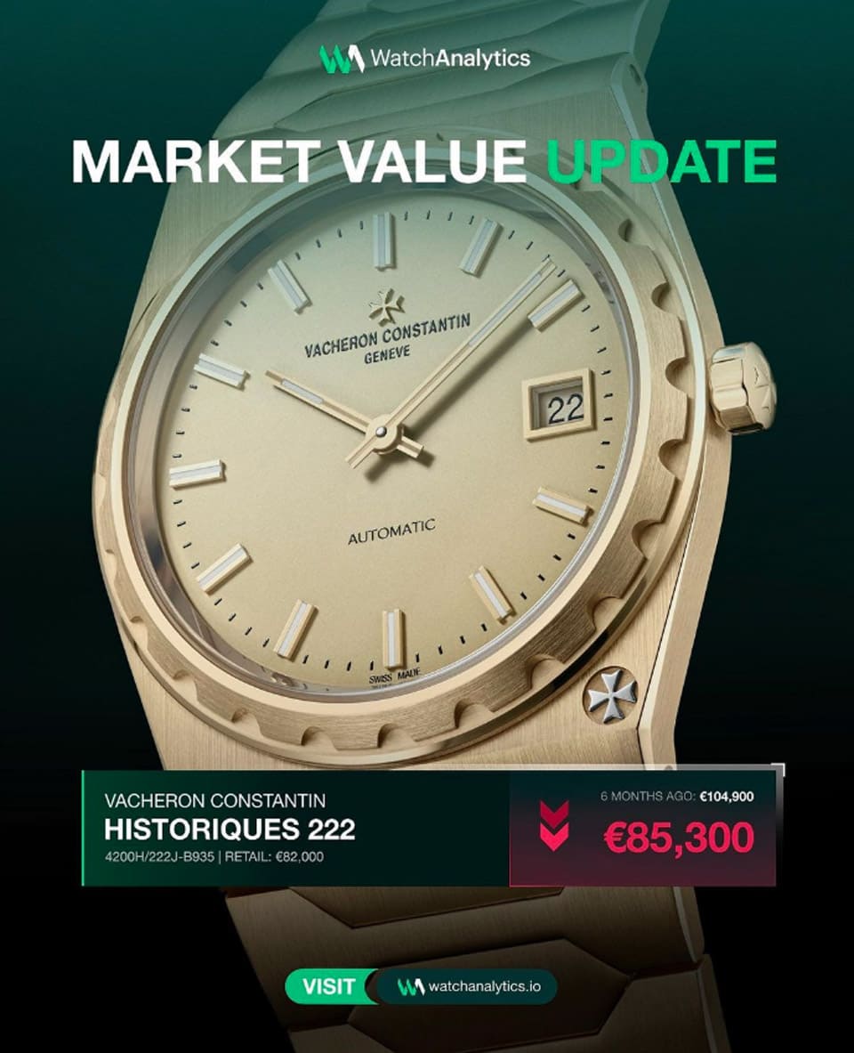 有點弔詭的是,Historiques 222大概是要到2023年初才慢慢開始有貨進入到二級市場,當時這款錶的行情達到104,900歐元(約合台幣360萬),超出定價一個檔次,可是就在手錶進入到二級市場展現它炙手可熱的搶手程度時,它也無法躲過高級品牌熱門錶整體行情下滑的影響,從那之後Historiques 222的身價也就每況愈下。