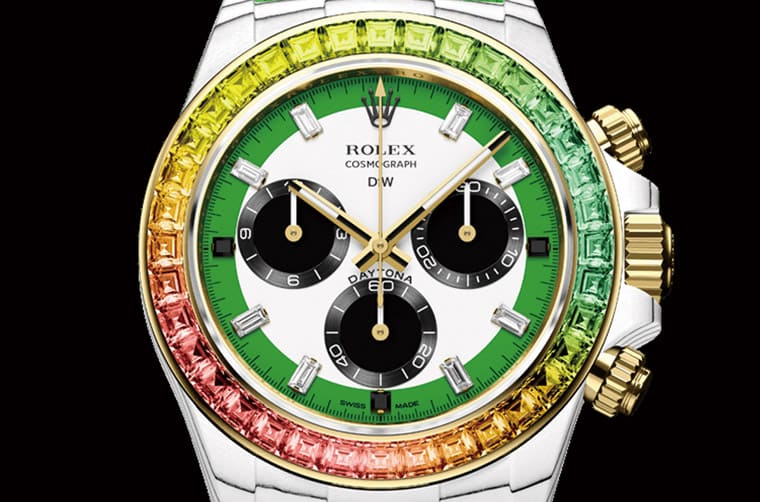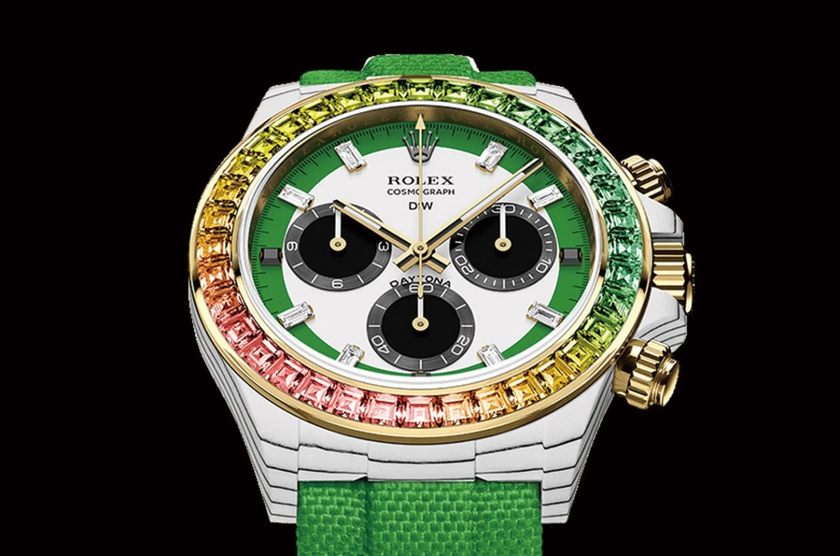 ▲DiW打造出錶圈鑲有綠色調彩色寶石組合的Daytona改錶,手錶名為”Wild Green”,由寶石串連的色彩層次效果的確讓人有「狂野」的感受。Source:Designa Individual Watches