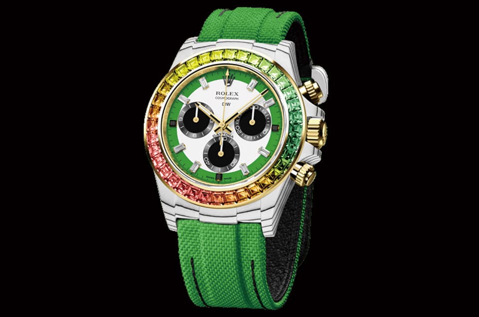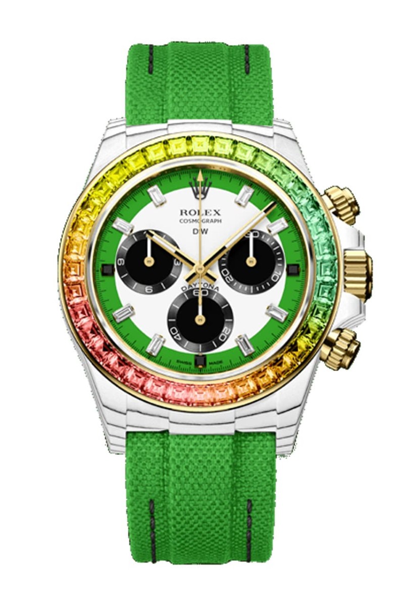 Designa Individual Watches(DiW)受到勞力士Daytona彩虹圈116595RBOW爆紅的啟發,近年也陸續創作出錶圈鑲有彩色寶石的Daytona改錶,本次要介紹的就是其中一款Rainbow Wild Green,顧名思義手錶的錶圈鑲上的鑽石主要以綠色調為主,再搭配上黃、橘、紅等暖色系寶石,使得手錶看起來生氣蓬勃,展現出源源不絕的活力個性。