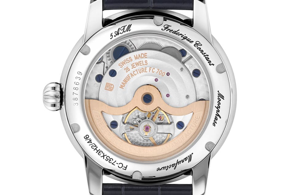 ▲錶背透明底蓋可見FC-735機芯具備K金鏤空自動盤,高級製錶針對機芯零件該有的打磨也都沒少。