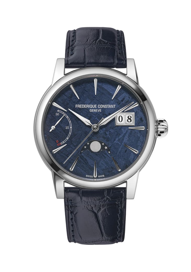 鉑金材質/FC-735自動上鍊機芯/時、分、秒、大日期顯示/動力儲存顯示/月相顯示/隕石面盤/藍寶石水晶鏡面、透明底蓋/防水30米/錶徑40mm/限量35只