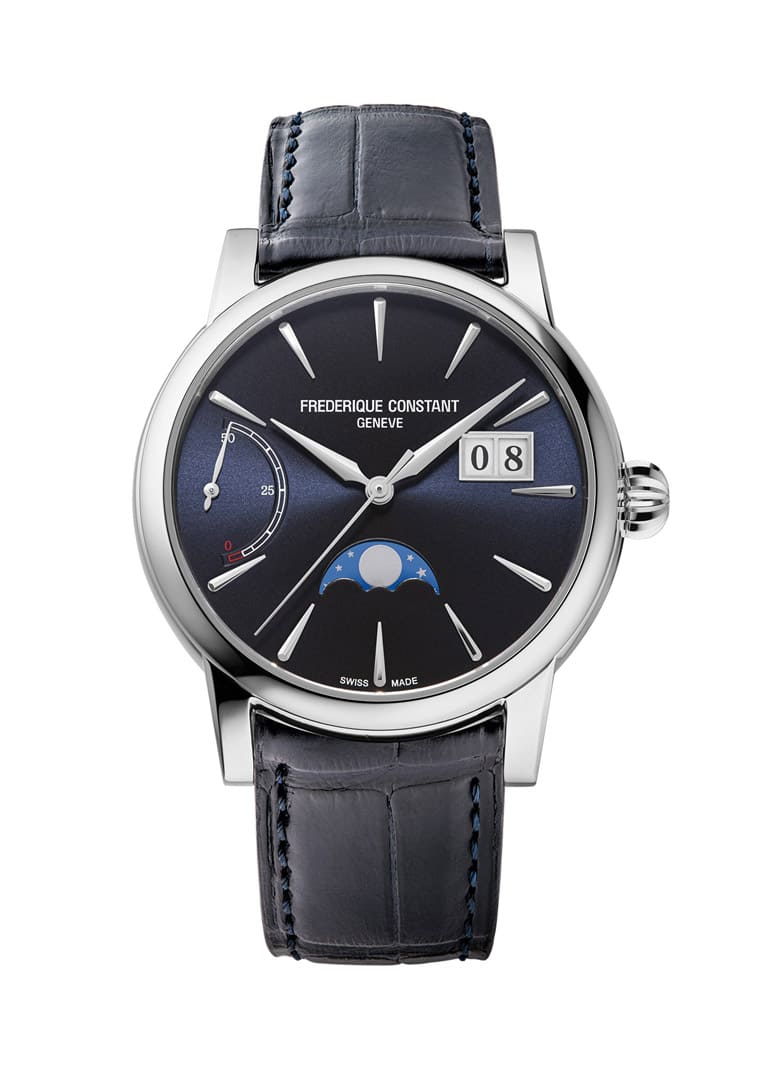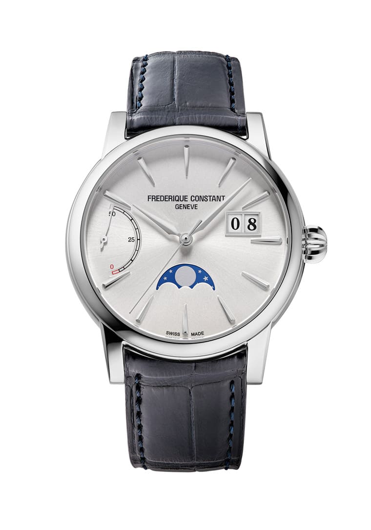 不鏽鋼材質/FC-735自動上鍊機芯/時、分、秒、大日期顯示/動力儲存顯示/月相顯示/藍寶石水晶鏡面、透明底蓋/防水50米/錶徑40mm