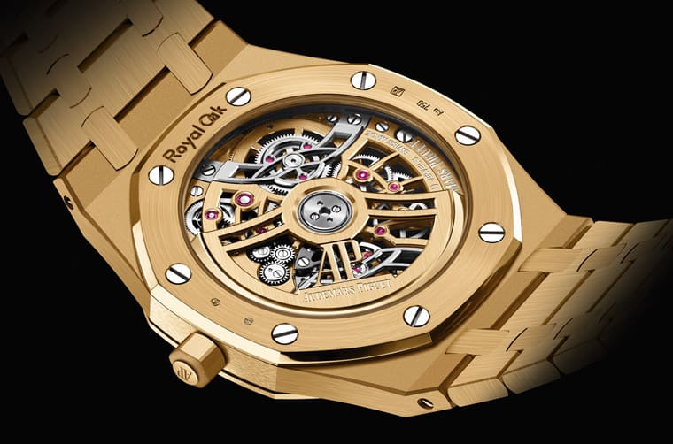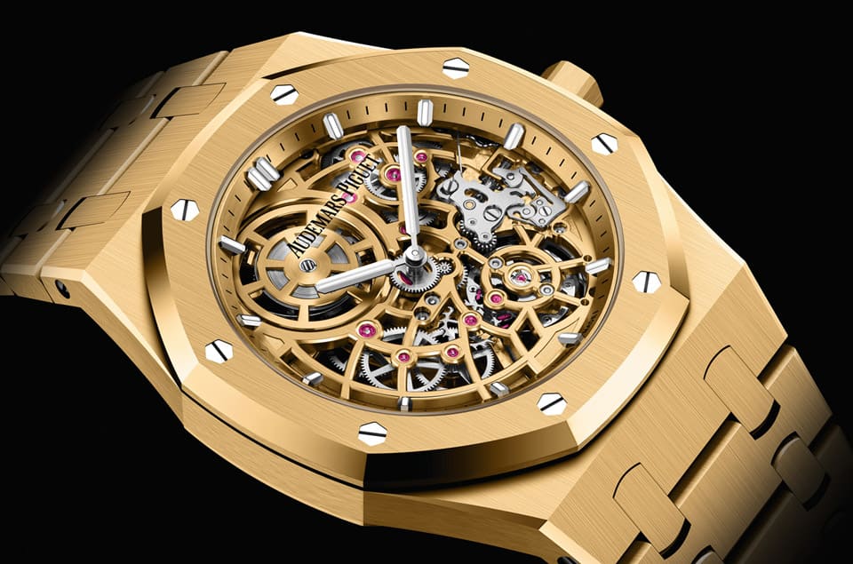 愛彼替皇家橡樹Jumbo超薄鏤空錶(16204)打造全新黃金款式,手錶搭載鏤空機芯,其金色系機芯與錶殼和鍊帶互相輝映,替這款品牌著名的經典作品帶來華麗耀眼的迷人光芒。