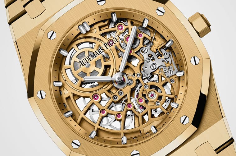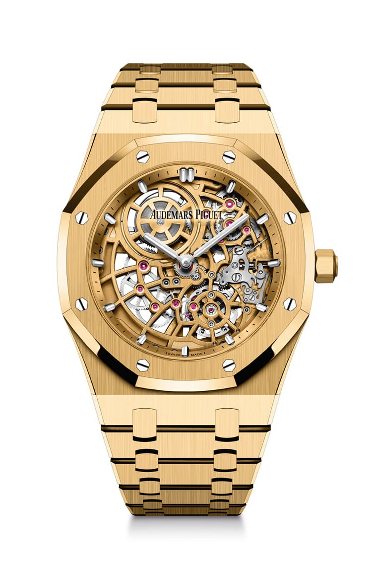 愛彼繼2022年推出的皇家橡樹Jumbo超薄鏤空錶不鏽鋼款與玫瑰金款後,2023年新增18K黃金版本,即使換了不同材質,錶殼厚度還是保持8.1mm的超薄水準,同時手錶還是延續現代RO的設計,包括寬度遞減的鍊帶錬節,以及錶殼零件交錯飾以霧面和拋光打磨等,造就手錶璀璨又富變化感的視覺效果。