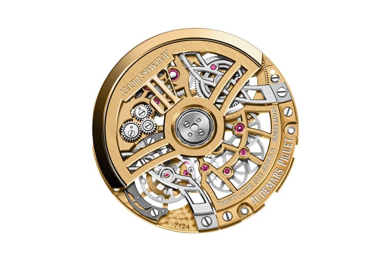 Royal Oak皇家橡樹Jumbo超薄鏤空錶搭載的7124機芯與皇家橡樹Jumbo超薄錶搭載的7121機芯先前乃是同時開發,機芯厚度僅2.7mm是整體纖薄的主要關鍵。機芯規格部分如4Hz震頻、57小時動力儲存都能符合現代要求,而且比起上一代的作品如5122機芯,7124機芯的發條盒變得更大,有助於機芯拉長精準走時的時間。這枚機芯的鏤空自動盤並非以黃金製成,實際上是在玫瑰金錶面鍍上黃金,愛彼將自動盤設置在滾珠軸承上,還開發出兩個轉換器進行以利進行雙向自動上錬,此外慣性砝碼乃是直接嵌入擺輪,此舉能避免零件產生多餘的摩擦,延長機芯壽命也有助於優化整體性能表現。