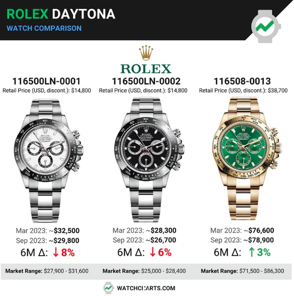 根據高級手錶市場調查研究機構WatchCharts最新的行情追蹤,鋼迪和綠金迪在2023年9月,也就是確定停產後半年間的身價呈現兩種走勢,原本一直都很強勢的白面與黑面116500LN價格比剛確定停產時要小跌一些,但是綠金迪最近又有開始漲起來的跡象,結果反而比半年前的行情還增長3%左右的數字,令人有點意想不到。