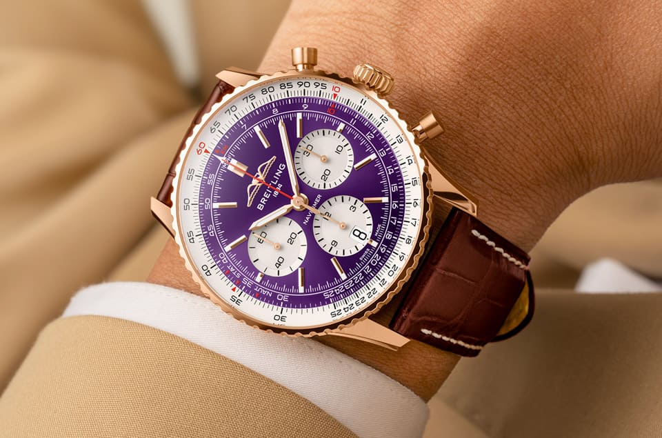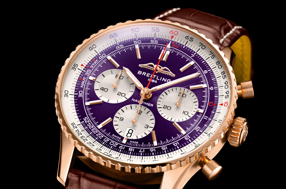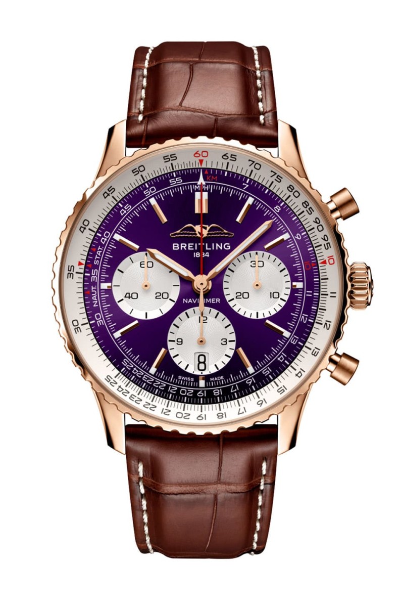 ▲錶款採用玫瑰金材質搭配紫色面盤,結合Navitimer經典的環形飛行滑尺、計時功能等設定,賦予手錶同中求異的收藏魅力。