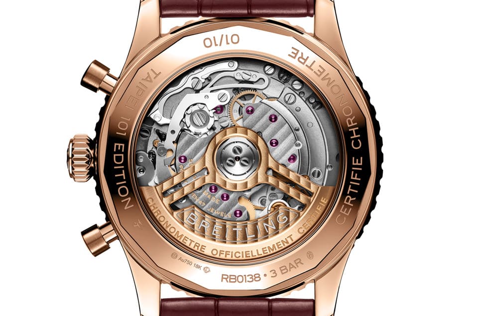 除了面盤的罕見配色,錶背透明底蓋也還有其他驚喜,佩戴者在一睹精密的B01自動機芯之餘,包括鏤空自動盤、日內瓦波紋、緞面修飾等都具有一定水準,甚至也能窺見傳統計時碼錶不可或缺的導柱輪機制,以及擒縱系統即時的運作動態,從自動盤邊緣鐫刻的文字可知機芯通過瑞士天文台認證,確保其走時品質值得信賴。前面提到的驚喜就展現在透明底蓋邊緣的K金部分,百年靈鐫刻了”TAIPEI 101 EDITION”字樣以及手錶的限量編號(限量10只),凡此都增添了手錶珍貴的收藏意義,因此一推出詢問度也非常高,成為最近百年靈的話題明星。