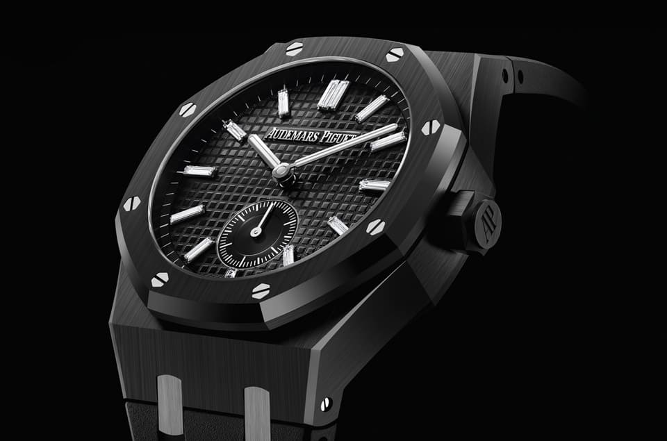 錶款的面盤擁有皇家橡樹系列招牌Grande Tapisserie大型格紋裝飾,面盤周圍鑲有白金立體琢面時標,而且時標和指針的表面都塗上夜光物料讓佩戴者在光線不足的情況下還是可以清楚辨識當前時刻。面盤6點方向設有小秒盤,從中呈現時間流逝的即使感,而且愛彼這次同步推出了兩款黑色陶瓷皇家橡樹超問錶,兩者的差別在於一款時標為白金、另一款則改鑲矩形切割鑽石,在低調的全黑外觀下衍生額外的華麗感。