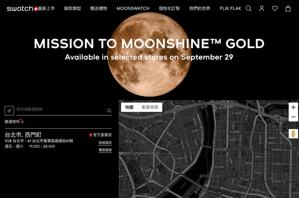 ▲由SWATCH公佈的最新MoonSwatch Mission to Moonshine™ Gold發售資訊中,可見台灣剩下西門町專賣店獨售。