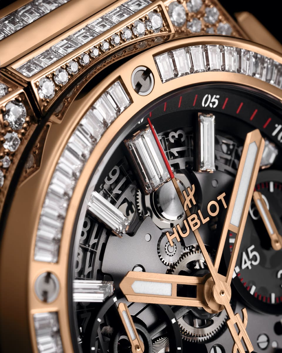 皇金材質/HUB1280 Uuico自動上鍊機芯/時、分、小秒、日期顯示/計時碼錶功能/錶殼鑲鑽78顆、錶圈鑲鑽54顆、面盤鑲鑽12顆、鍊帶與錶扣鑲鑽450顆/藍寶石水晶鏡面、透明底蓋/防水100米/錶徑42mm/參考價:NT$ 6,867,000