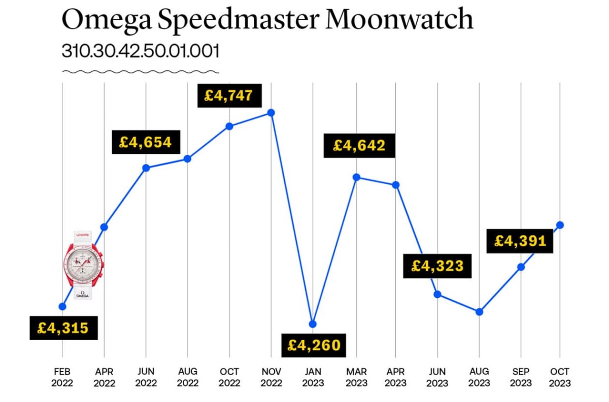 而到了2022年10月,登月錶在國外二級市場的價格一度達到4,747英鎊(約合台幣18萬6)的高峰,比MoonSwatch發表前2022年2月的平均價格4,315英鎊(約合台幣16萬9)高出一截,只是從那之後,登月錶的行情就反覆出現下跌-上漲的循環,到2023年1月時,還曾經跌到比MoonSwatch推出前價碼更低的4,260英鎊(約合台幣16萬7)水準;而又過了大半年後的現在,登月錶行情慢慢回復到4,391英鎊(約合台幣17萬2),等於繞了一圈後,行情又回到原點的概念。