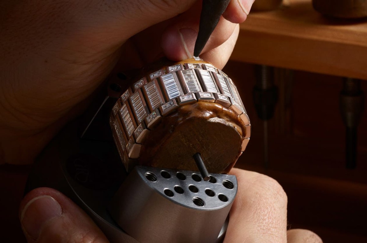 ▲腕錶外部零件表面一一鑲上方鑽或圓鑽,每一寸空間都經過精密細算,沒有多餘或留白的空間。