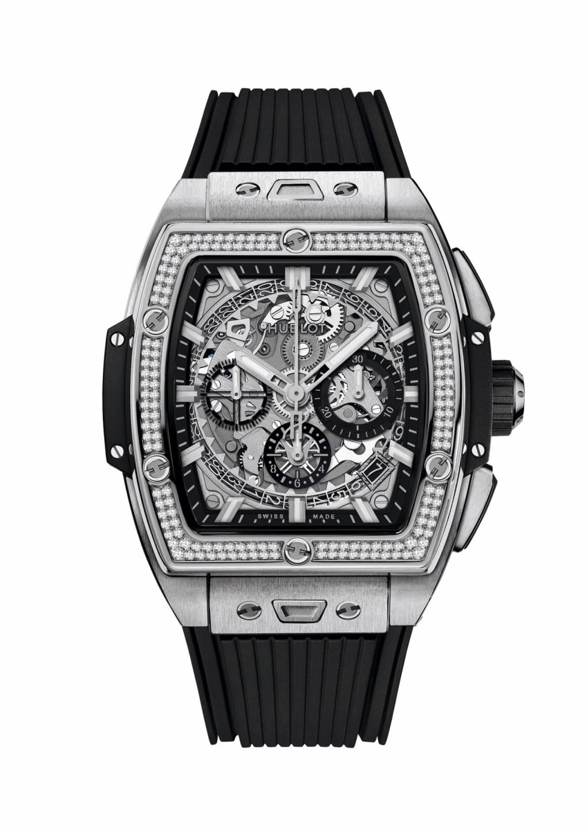鈦金屬材質/HUB4700自動上鍊機芯/時、分、小秒、日期顯示/計時碼錶功能/錶圈鑲鑽48顆,約重1.5克拉、錶殼鑲鑽166顆/藍寶石水晶鏡面、透明底蓋/防水100米/錶徑42mm/參考價:NT$ 1,174,000