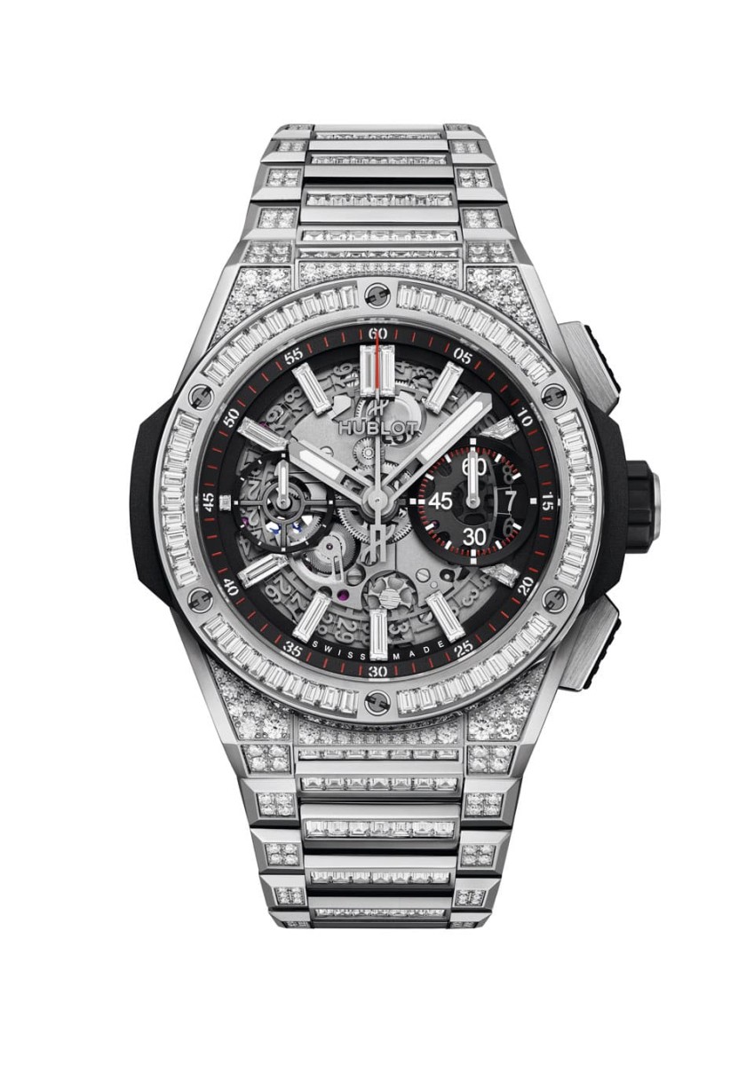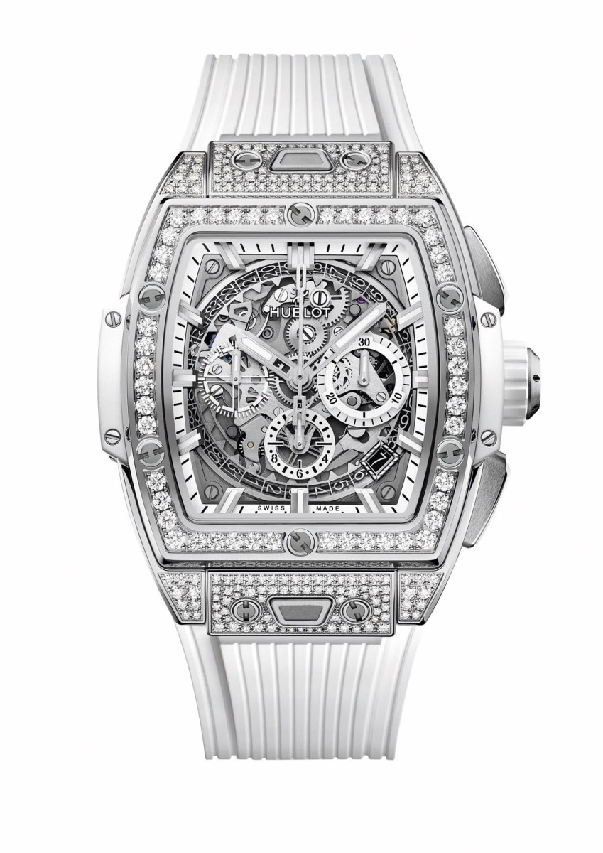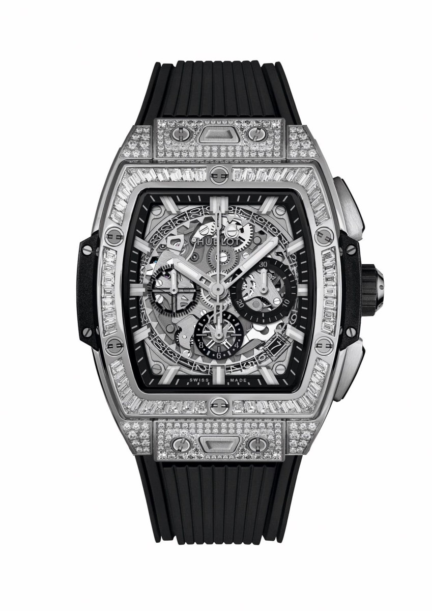 鈦金屬材質/HUB1280 Uuico自動上鍊機芯/時、分、小秒、日期顯示/計時碼錶功能/錶殼鑲鑽78顆、錶圈鑲鑽54顆、面盤鑲鑽12顆、鍊帶與錶扣鑲鑽450顆/藍寶石水晶鏡面、透明底蓋/防水100米/錶徑42mm/參考價:NT$ 5,723,000