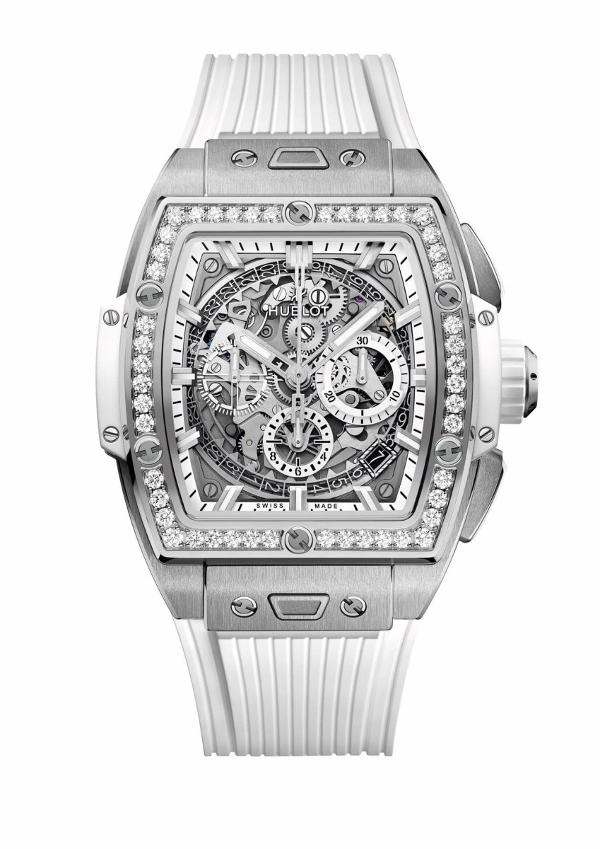 鈦金屬材質/HUB4700自動上鍊機芯/時、分、小秒、日期顯示/計時碼錶功能/錶圈鑲鑽48顆,約重1.5克拉/藍寶石水晶鏡面、透明底蓋/防水100米/錶徑42mm/參考價:NT$ 913,000