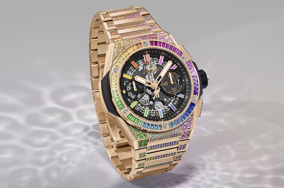 ▲宇舶罕見創作出錶殼、錶圈與鍊帶皆鑲上彩色寶石的作品,藝高人膽大的設計讓人印象極深。