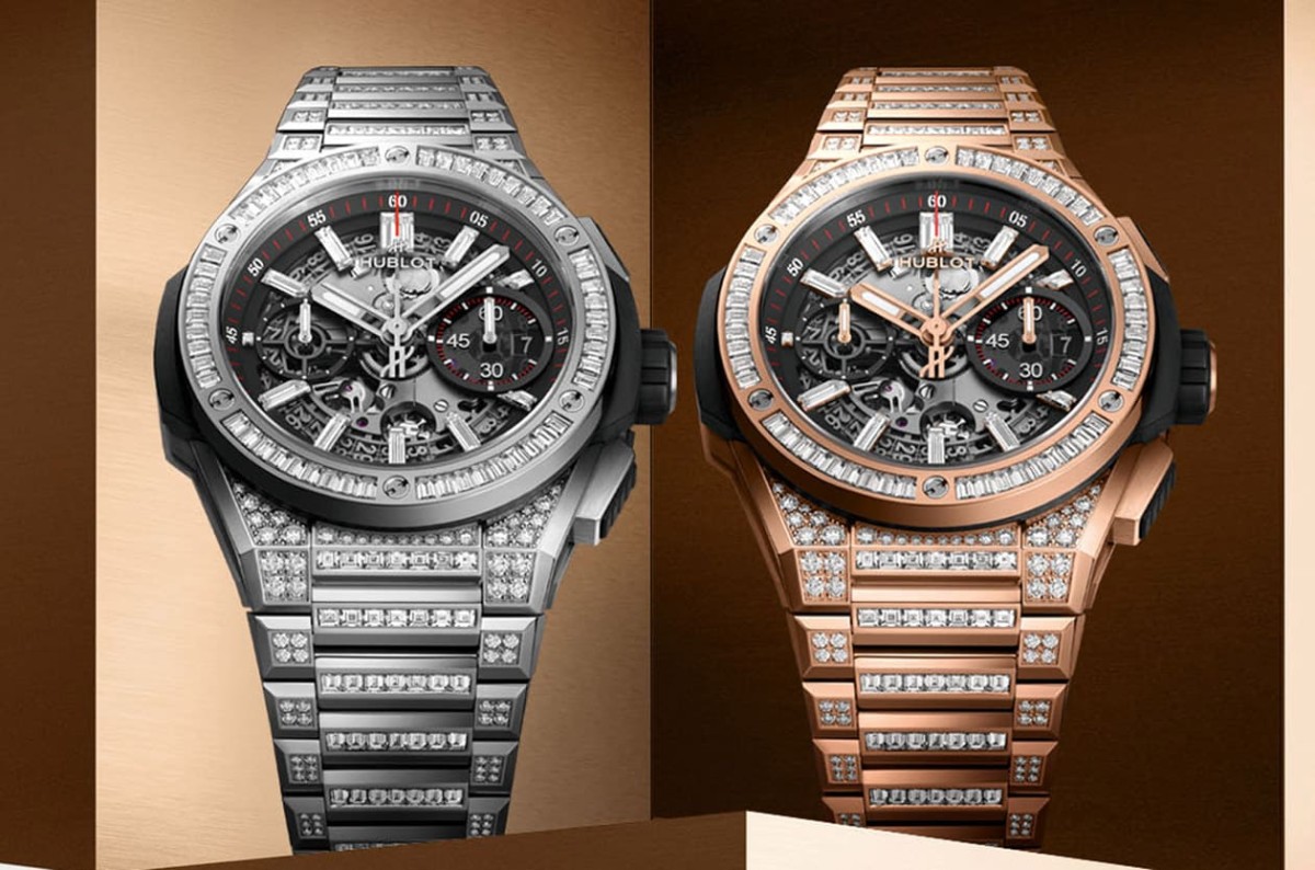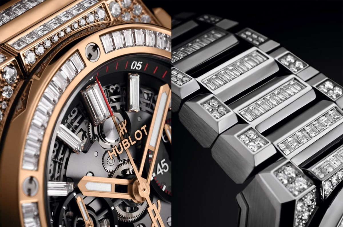 Big Bang大爆炸系列過往便曾推出在錶殼與鍊帶鑲鑽的作品,但是Big Bang Integrated方鑽鍊帶計時碼錶特色在於鑲嵌鑽石的切割方式並非單一類型,而是以方鑽為主,並輔以同樣數量眾多的圓鑽,在整只錶的錶殼、錶圈與鍊帶交織出彷彿有層次的鑽石光芒。宇舶分別推出鈦金屬與皇金兩種版本,其皆奠基於Big Bang Integrated計時碼錶,因此包括三明治錶殼結構、外型富有品牌辨識度的一體式鍊帶,以及開面設計計時功能面盤格局等特徵都不變,不過品牌也為了在腕錶鑲滿鑽石花費許多時間篩選高等級鑽石,同時還要經過一連串的切割、塑形與打磨之後,才能進入到鑲嵌工序。