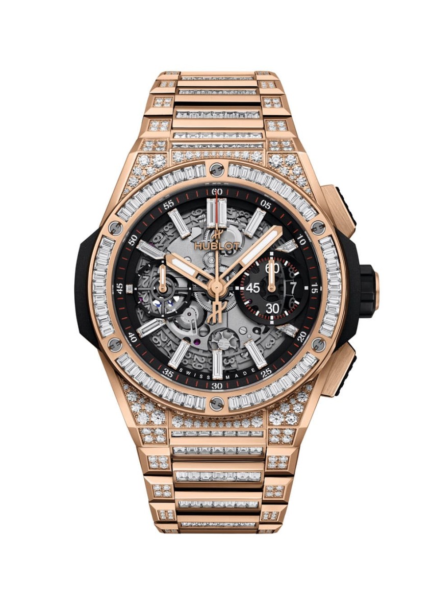18K皇金材質/HUB1280 Uuico自動上鍊機芯/時、分、小秒、日期顯示/計時碼錶功能/錶殼鑲鑽78顆、錶圈鑲鑽54顆、面盤鑲鑽12顆、鍊帶與錶扣鑲鑽450顆/藍寶石水晶鏡面、透明底蓋/防水100米/錶徑42mm/參考價:NT$ 6,867,000