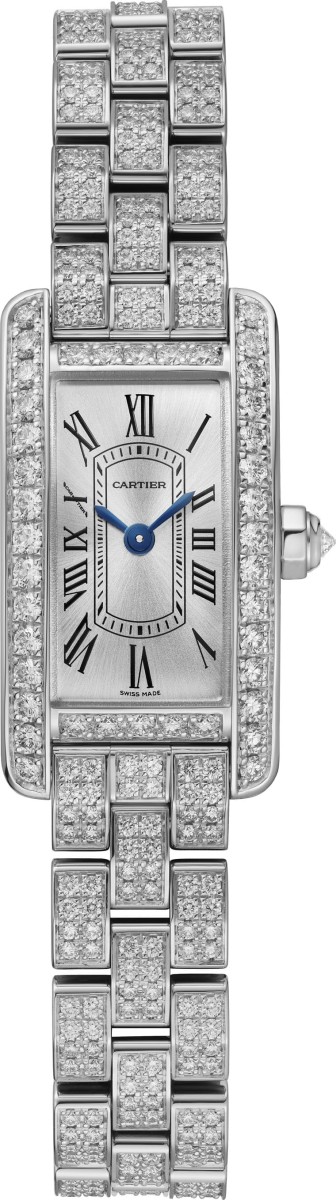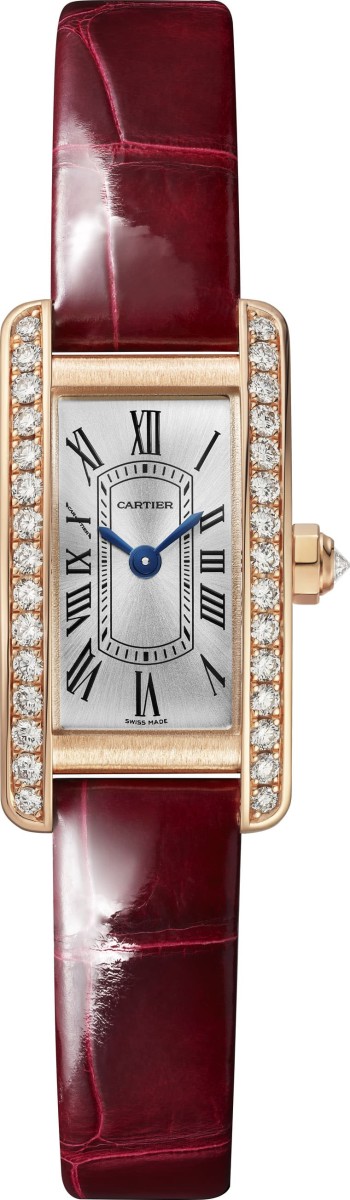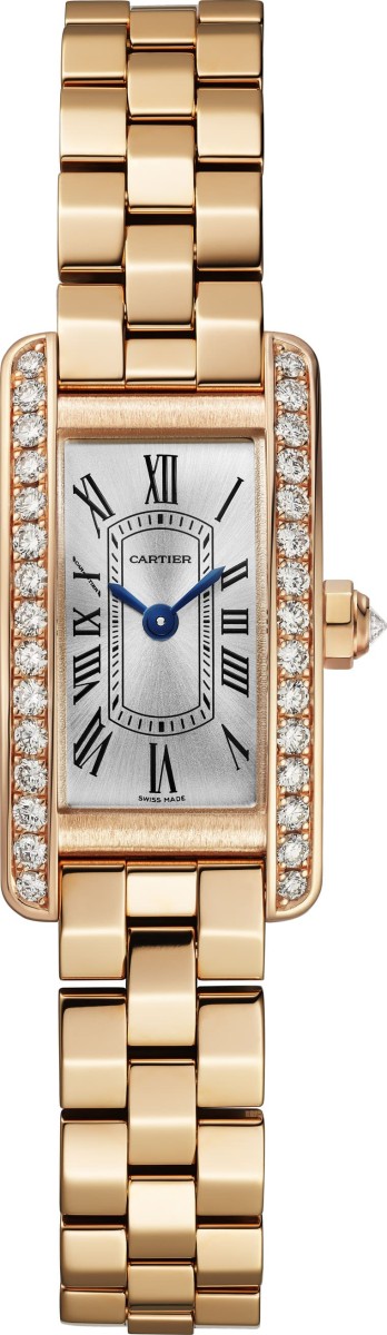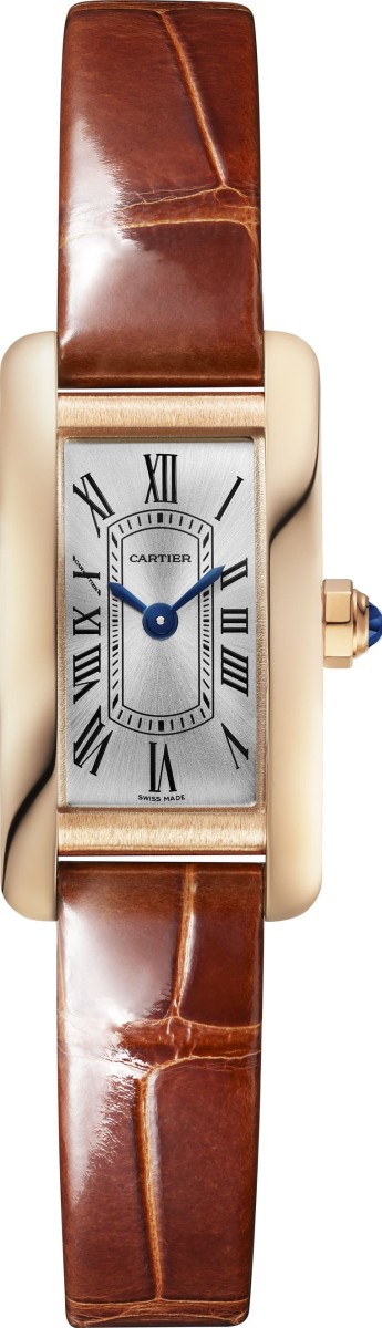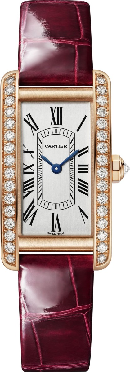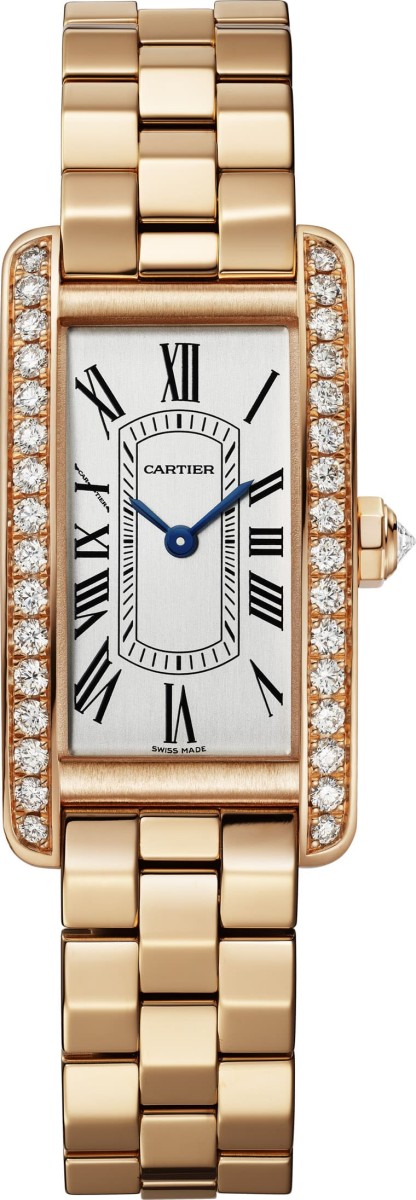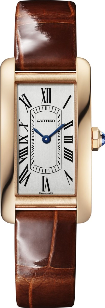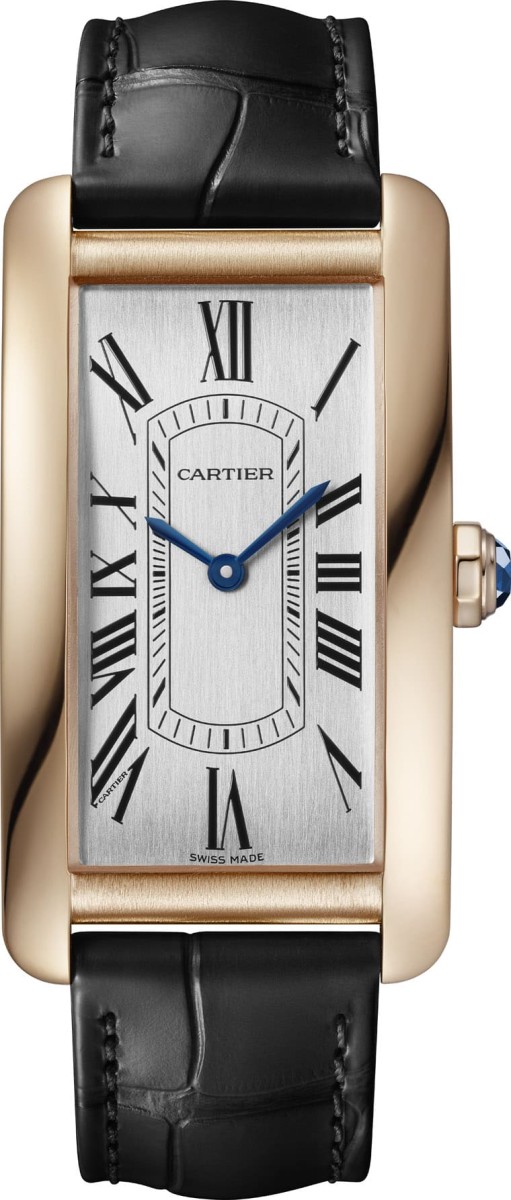 美國坦克腕錶外型比傳統的坦克腕錶更為修長,甚至還帶有弧度,使腕錶佩戴時更為舒適。卡地亞最先於1989年開發出這款坦克系列的變體,由於當時市場正要開始流行大錶熱潮,因此尺寸相對更大的Tank Américaine便是品牌回應市場需求的重要一步棋,卡地亞對於美國坦克腕錶外型的設計拿捏得宜,因此至今它仍是經典的坦克腕錶代表之一。Tank Américaine具備的弧形錶殼設計靈感其實是源自於Tank Cintrée腕錶。同時,Tank Américaine腕錶也是系列中第一款搭配可調校錶帶的作品,用以匹配1909年獲得專利的卡地亞摺疊錶扣。