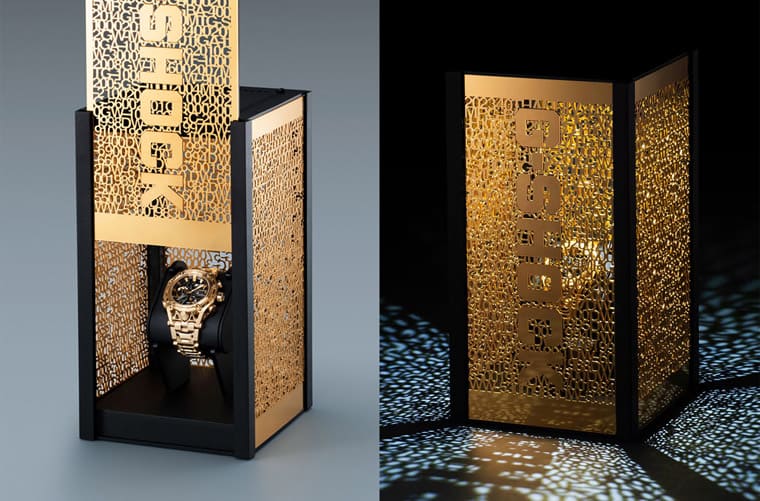 相較於G-D5000-9JR限量發行35只,G-D001僅做了一只而已,G-SHOCK也特別替手錶打造了一個相當精緻的錶盒——與錶殼和鍊帶一樣是用黃金材質,鏤空造型細看會發現上面的文字與數字乃是歷代G-SHOCK手錶型號,結合40週年主題顯得別具紀念意義,而且錶盒裡面還設有LED燈,可以作為展示手錶時使用的加分元素。而在富藝斯拍賣會上所拍出的善款,G-SHOCK打算捐贈給環保團體,為地球永續發展盡一份力。