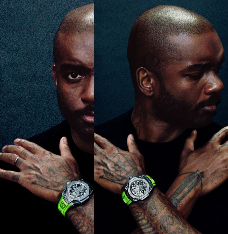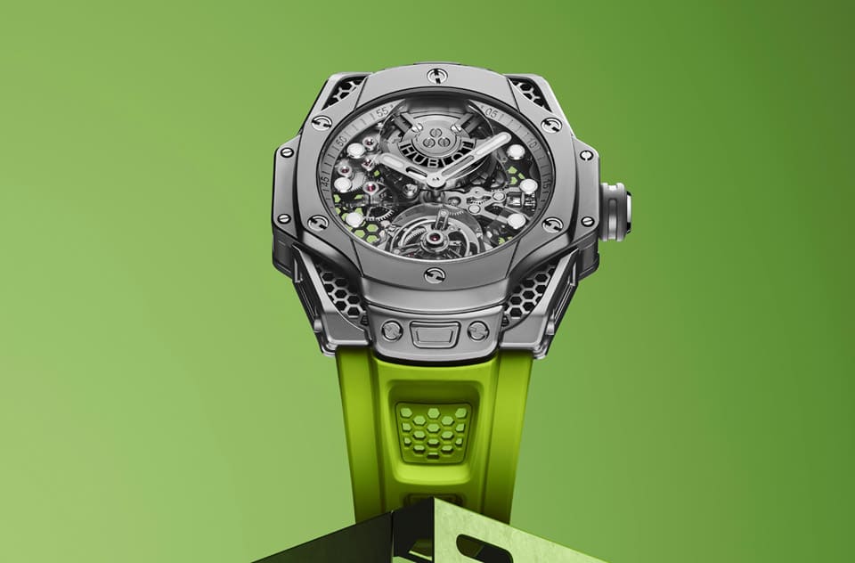 HUBLOT宇舶繼2022年與英國知名設計師、時裝品牌A-COLD-WALL*主理人Samuel Ross攜手創作聯名錶Big Bang Tourbillion Samuel Ross之後,2023年雙方再接再厲推出新改款的Big Bang Samuel Ross極光綠陀飛輪,望名知意手錶延續上一款的基礎,不過在設計細節方面出現新意,其中包括材質與錶帶顏色方面,手錶都有著比較容易區辨的差異。