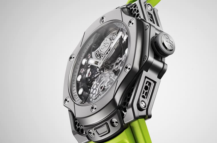 手錶這次依舊採用鈦金屬材質,錶殼44mm相當大器顯眼,宇舶採用鉛灰色微珠噴砂處理,賦予錶殼、錶圈和錶扣俐落且不易突顯刮痕或指紋的外型,相較於上一款Big Bang Tourbillion Samuel Ross採用橘色橡膠包覆錶殼與錶冠,宇舶這次「僅」在錶冠附上灰色橡膠材質呼應鈦金屬的加工修飾。不使用橡膠包覆錶殼之後,Big Bang Samuel Ross極光綠陀飛輪的鏤空蜂巢狀設計因而能夠看得更清楚,品牌在製作過程中需經過拋光、磨砂、錘擊和穿孔等工序,才能形成最終手錶呈現的奇特造型,既有點像透明錶殼擁有開放視野,卻也保留金屬錶殼一部分的隱蔽性,若隱若現的設計有助於彰顯機芯的立體層次構造,讓佩戴者閱讀時間同時也能感受機械錶的精密與嚴謹。