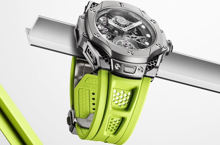雖然錶殼、錶冠等零件去除了橡膠包覆或改為比較低調的橡膠顏色,但是宇舶替Big Bang Samuel Ross極光綠陀飛輪搭配的橡膠錶帶(錶帶局部同樣有蜂巢狀結構)還是選擇了第一眼印象強烈的極光綠色調,而從上下錶耳的梯形按把可知,Big Bang Samuel Ross極光綠陀飛輪擁有宇舶專利One Click錶帶快拆系統,品牌也貼心地另外提供黑白兩色橡膠錶帶給錶主(設計也都蘊含立體蜂巢狀結構),讓人可以隨時視場合更換不同顏色的錶帶,搭配性因而更加全面。