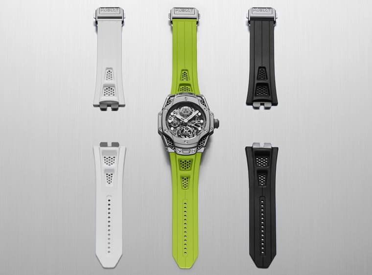▲Big Bang Samuel Ross極光綠陀飛輪會額外附上白色與黑色橡膠錶帶,供錶主自行替換。
