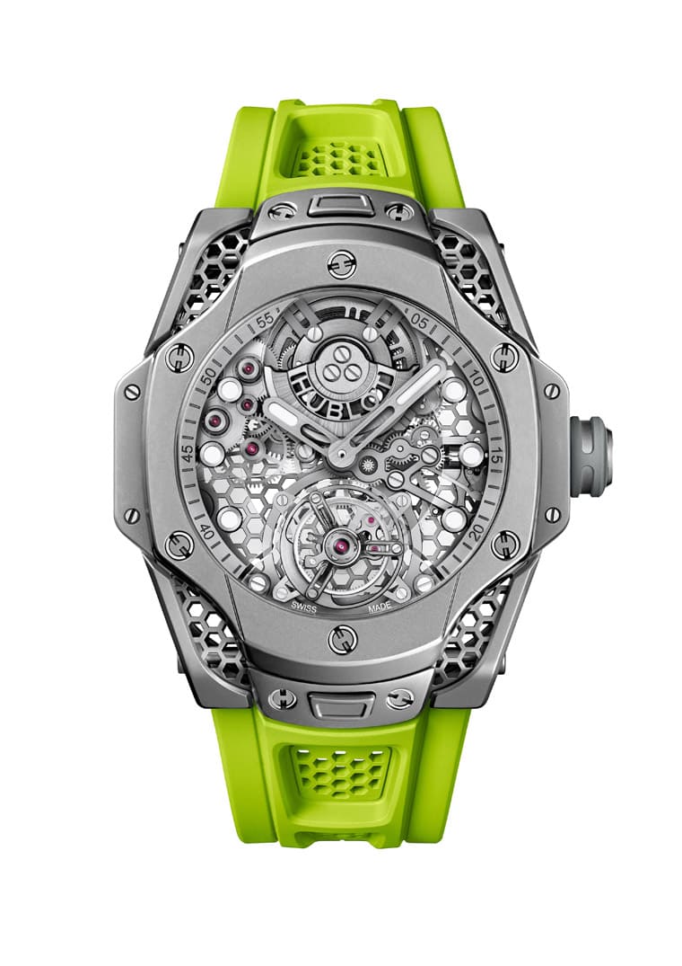 鈦金屬材質/HUB6035自動上鍊機芯/時、分顯示/陀飛輪裝置/藍寶石水晶鏡面、透明底蓋/防水30米/錶徑44mm/限量50只/參考價:NT$ 3,924,000