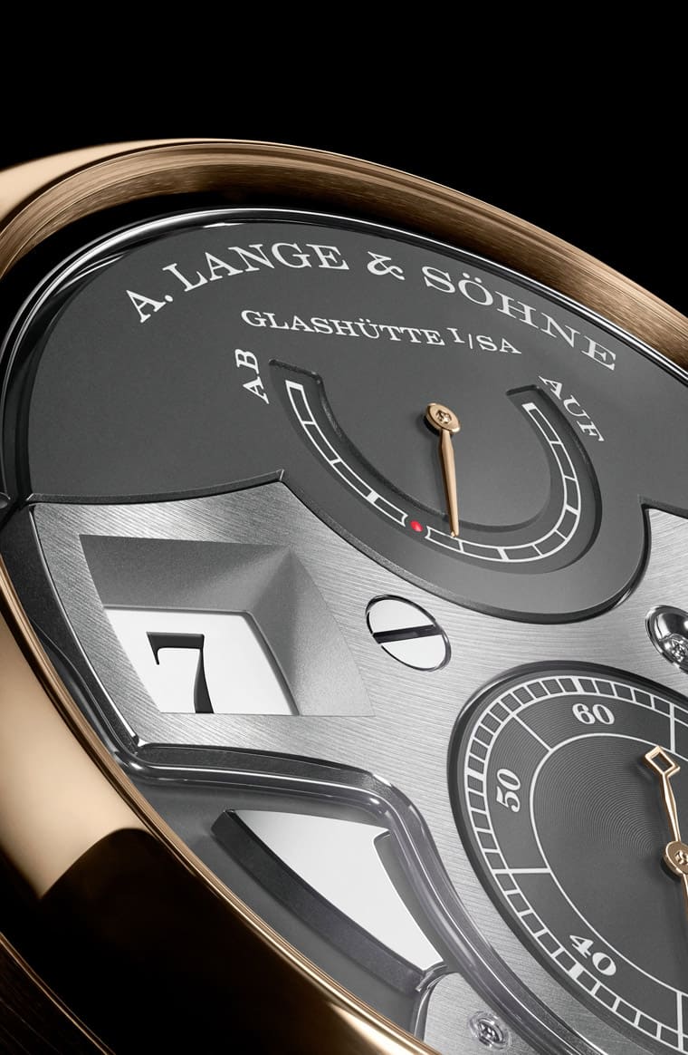 面盤上可見音簧與音錘等報時裝置重要組件,朗格分別對音簧施加拋光處理、音錘進行黑色平面拋光,佩戴者可以好整以暇地享受三問功能啟動時,音錘直接展演敲擊音簧的動感畫面,配合悠揚的樂音簡直就是一場魅力四射的雙重感官饗宴。