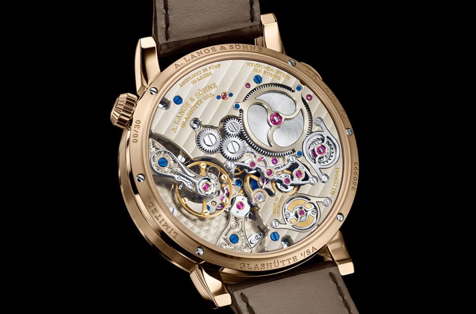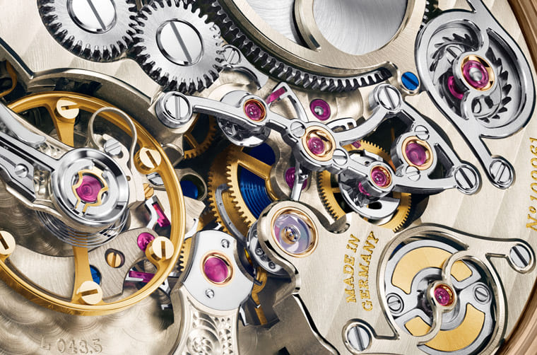 佩戴者翻到錶背能夠一睹L043.5機芯風采,3/4夾板由未經處理的德國銀製造,機芯零件都經過手工精心修飾,例如擺輪夾板便有精緻的手工雕花,其下方的擺輪蘊含偏心砝碼和無卡度游絲,每小時震頻達18,800vph,由於手錶的功能相當複雜,光是零件數就有771枚之多,光是欣賞機芯作工便能獲得高度滿足感,這也是朗格這類旗艦作品深受深藏家喜愛的箇中奧妙。