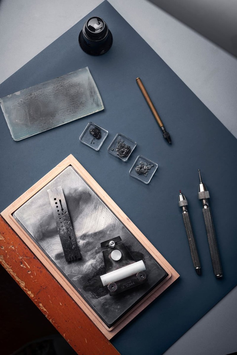 根據品牌表示,手錶啟用的隕石材質是在非洲納米比亞的吉貝翁(Gibéon)尋獲的太空碎片。隕石由於內含大量的鐵,長時間曝露在自然環境中會有碎裂、腐蝕的風險,而若用隕石來製作手錶面盤,最重要的一點是要能切割出一個完整又光滑的圓盤,其中不能有任何縫隙,以免水氣、灰塵等從面盤滲入錶殼內部,久而久之可能對機芯零件造成影響。康斯登一方面要顧及隕石裁切後的品質,也要小心翼翼將之維持在0.5mm的纖薄程度以符合手錶設計的要求,品牌也額外在面盤表面加上鍍釕塗層,目的有兩個,一個是用以強化自然灰色反光,另一個則是防止隕石的表面產生氧化。