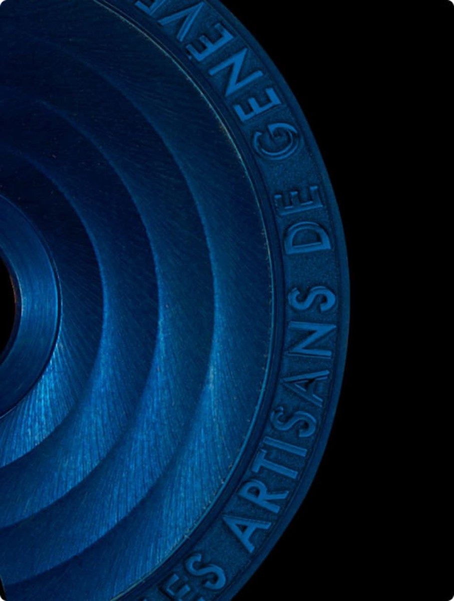 自動盤以21K金製成,改裝錶品牌以環形日內瓦波紋修飾,外緣以陽刻方式刻上自家的名稱,最後自動盤呈現的藍色乃是用PVD技術鍍上,自此形成機芯與面盤細節零件一致的藍色調。