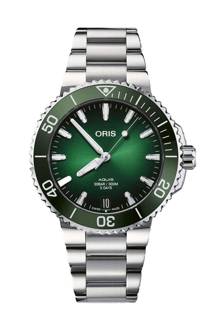 Aquis日期錶還是不鏽鋼錶殼,其中這款的陶瓷錶圈是和綠色太陽紋面盤輝映的顏色,表現出內外呼應的統一色調。過去Aquis原本就有綠色陶瓷圈搭綠面的款式,甚至錶徑從39.5、41.5到43.5mm都有,但是ORIS直到這款41.5mm作品誕生才首度將Calibre 400套用在綠色面盤款式上,對於喜歡這種近年熱門顏色的人而言,這款錶的規格無疑是目前Aquis系列的巔峰,雖然它的價位比起一般Aquis潛水錶要高出一截,但想想手錶和機芯擁有的規格,多追加預算鎖定這款還是顯得頗為划算。與搭載通用機芯的款式相較,從Calibre 400版本的Aquis日期錶面盤6點方向的字樣可以看出彼此的差異,如前者多了”PRESSURE RESISTANT”字樣,後者則是移除這行字樣並在防水性能數據下方增加”5DAYS”字樣,透過細節暗示手錶搭載的機芯有深度進化。