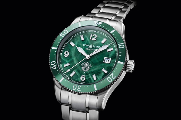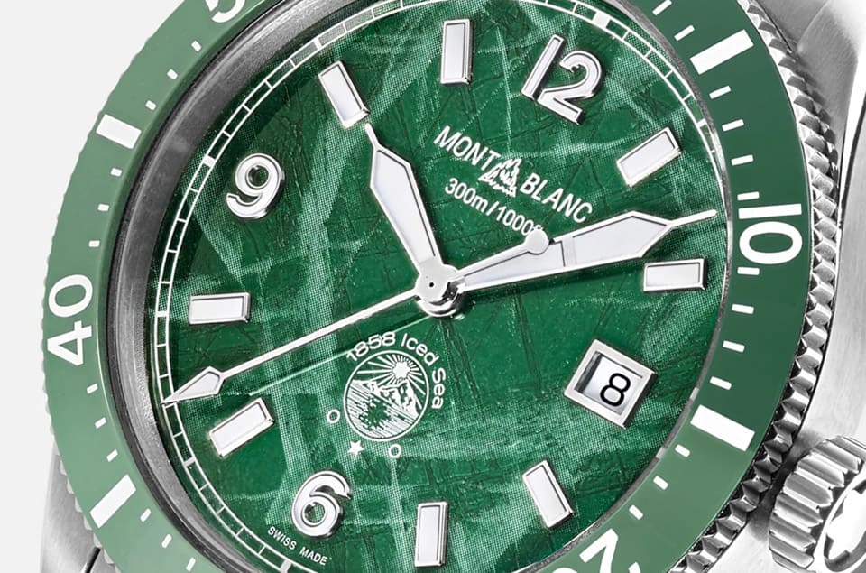 錶款採用不鏽鋼材質,錶殼41mm是現今運動錶的主流尺寸,此外品牌還替手錶配置了綠色的陶瓷圈,另外翻到錶背會看到上頭有立體浮雕冰山與正在探索下方冰河水域的潛水者圖案,光是鐫刻這個圖案的工法就是一道難題,然而當品牌克服技術限制後,呈現在手錶上的成果大家有目共睹。1858系列Iced Sea日期顯示自動錶搭配與錶圈相同顏色的面盤,而且萬寶龍選擇顏色時並非只是選些熱門色,而是在其中寄寓一些和系列精神呼應的元素,例如綠色就是代表南極洲冰川映現雪藻的顏色,若只是單純的綠色你可能會覺得這樣的配色靈感可能有點牽強,但是這系列潛水錶吸引人的地方就在於它有高辨識度的面盤裝飾。