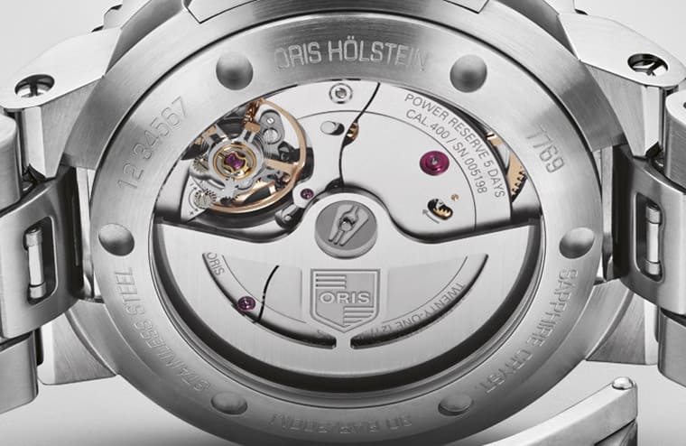 錶背透明底蓋露出的Calibre 400機芯是這款錶的絕對重點,它有許多ORIS新開發的設計亮點,例如採用滑動軸承機制搭配全新的齒牙設計,這種組合可以讓扭力釋放更平均,因此據稱精準度達到每日-3~+5秒,超過COSC瑞士天文台認證水準,另外機芯經過測試能抵抗2,250高斯磁性,比起ISO 764標準規定要能抵抗200高斯磁力的水準要高出許多。還有一點不得不提,Aquis系列一般搭載的733機芯動力儲存為38小時,但是Calibre 400機芯是運用雙發條盒加上改良過後的自動盤降低動能耗損,使得機芯動力可以達到5日鍊!以前的Aquis潛水錶若週末兩天沒戴錶,隔週一要上班時必需要先重新上鍊,如今改搭載Calibre 400機芯後,手錶令人感到困擾的部分馬上迎刃而解。而隨著機芯規格的深度進化,ORIS也提供錶主只要到品牌官網註冊登錄手錶資訊後,就可以獲得10年保固的福利,從以上這些特點看來,不難理解為什麼平平是Aquis日期錶,裝了Calibre 400的價格會衝上接近10萬大關,畢竟研發機芯的成本就存在不小差距了。