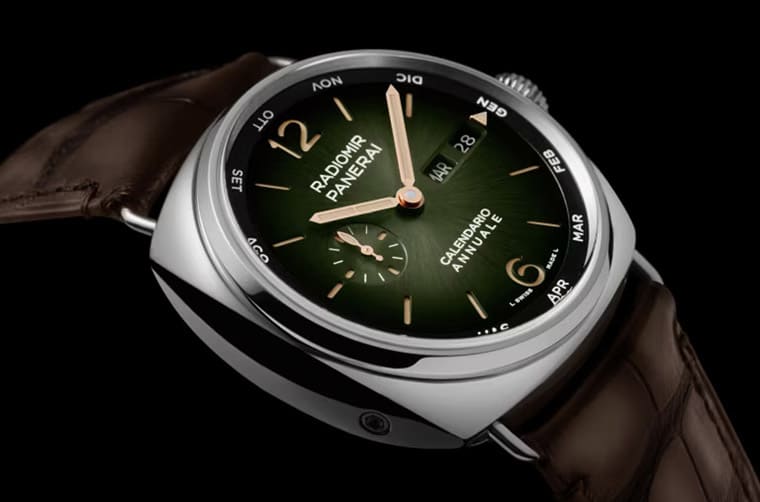 沛納海為了烘托特別版Radiomir年曆錶與之前體驗版的差別,替手錶換成了深棕色鱷魚皮錶帶,再來面盤也改成漸層效果的綠色太陽放射紋,而雖然指針還是呈現紅金色調,不過品牌將Super-Luminova®夜光塗層改為米黃色,搭配漸層綠面以及銀白色調的錶殼相得益彰。
