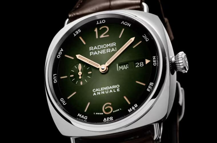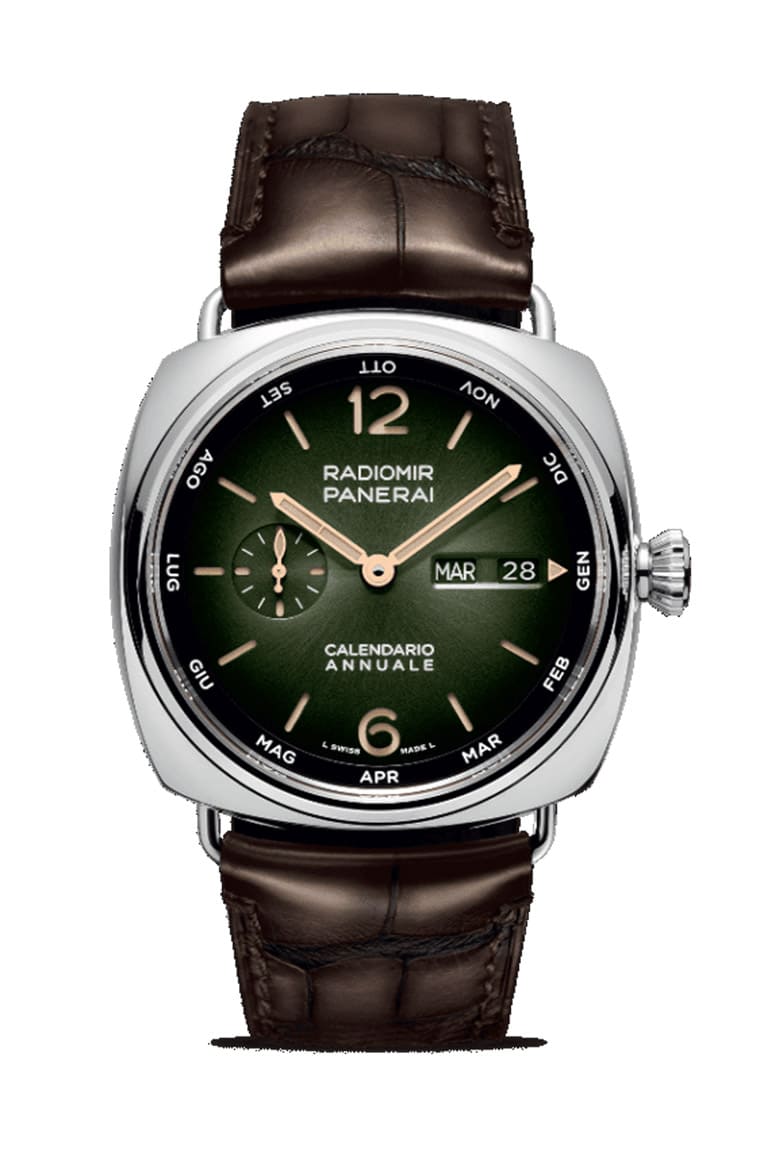 ▲PAM01364採用Platinumtech™材質,搭配棕色鱷魚皮錶帶與漸層綠面,並具備沛納海手錶首見的年曆功能。