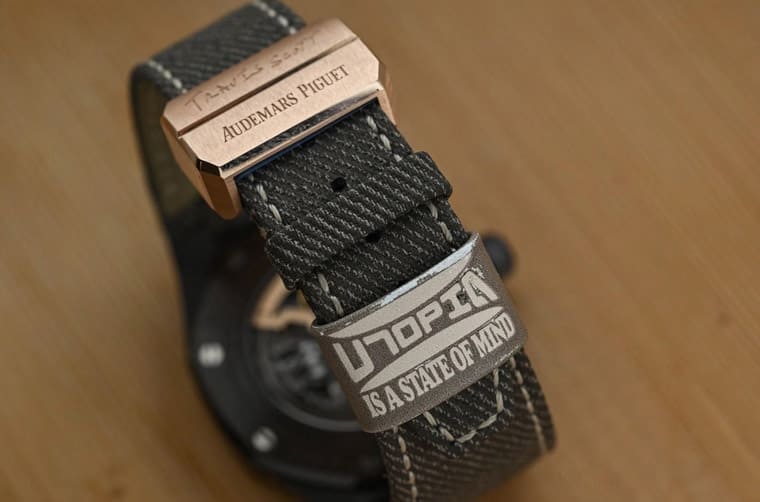 皇家橡樹系列目前具有萬年曆功能的作品超過10款,扣掉2兩款Grande Complication大複雜錶,只有1款黑陶瓷款和1款白金滿天星款採用鏤空面盤設計,因此AP x Travis Scott皇家橡樹鏤空萬年曆屬於系列中罕見的鏤空設計款式,而且它還是這些皇家橡樹萬年曆手錶中唯一採用皮錶帶的(棕色小牛皮)的特例,錶帶搭配玫瑰金折疊扣,上頭刻有品牌Logo與Travis Scott簽名字樣,另外錶帶環上則印有“Utopia is a state of mind”這個和《Utopia》專輯呼應的標語。光是棕色陶瓷錶殼加上棕色皮帶就已經讓這款手錶別具一格了,然而只要有Travis Scott參與創作的產品,往往都會有鮮明易辨的風格,這意味著手錶還有更多看頭。
