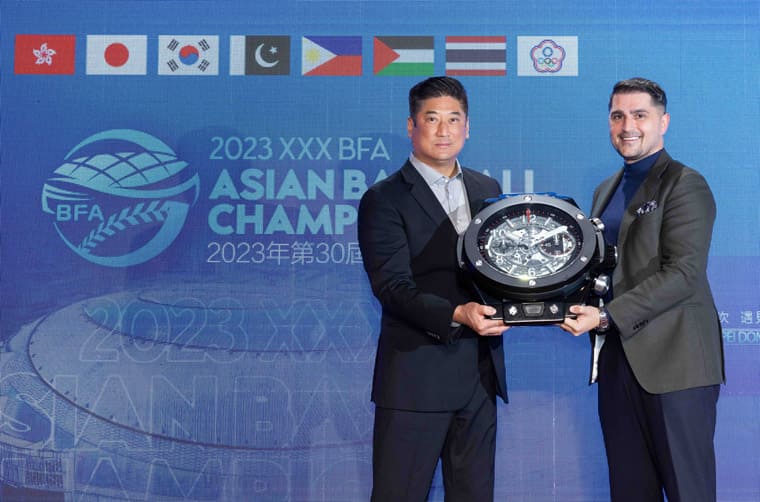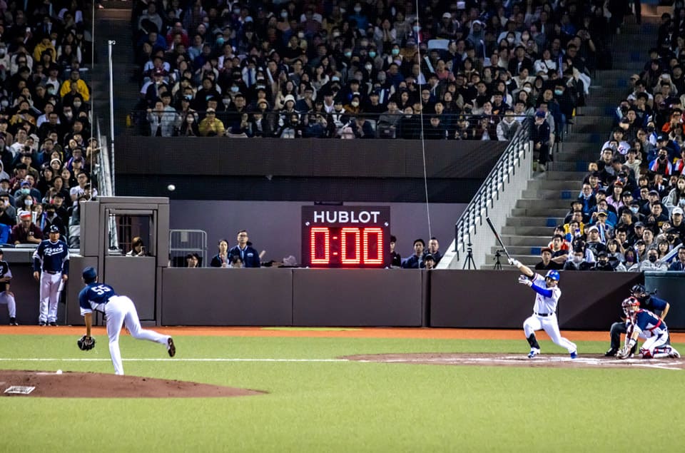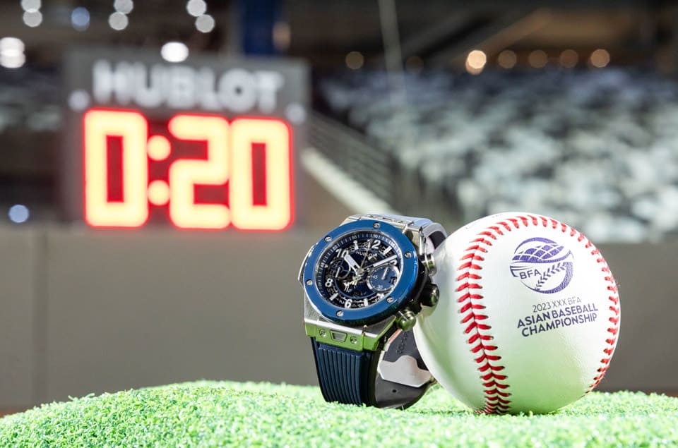 如果你昨天有去現場,應該多少也會注意到現場官方時計的存在,像是在本壘板附近就會看到大大的「投球計時器」,這個裝置的設計非常簡單,就是一個”HUBLOT”標誌,再加上分鐘與秒數的數位顯示(作用在於倒數20秒投球限制時間),看到這你就明白了,這次擔任第30屆亞錦賽官方時計的是HUBLOT宇舶,他們家從2015年起開始投入支持棒球運動,歷年來曾擔任WBSC世界棒球12強比賽、WBC世界棒球經典賽等賽事的官方時計,品牌這次也是第一次和亞錦賽合作,除了在現場設置從投手丘上可以一目了然的投球計時器之外,宇舶也特別致贈一款紀念掛鐘給亞洲棒球總會,由品牌大中華區總經理Omar Choudhary先生親手交給亞洲棒球總會會長辜仲諒先生。